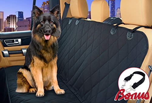 Car Seat Cover for Dog. Fits Auto, SUV and Truck - Hammock Mode, Waterproof, Stay in Place Anchors & Velcro Seat Belt Opening. Rich Black, Oxford Nonslip Backing. Bonus: Seat Belt Included