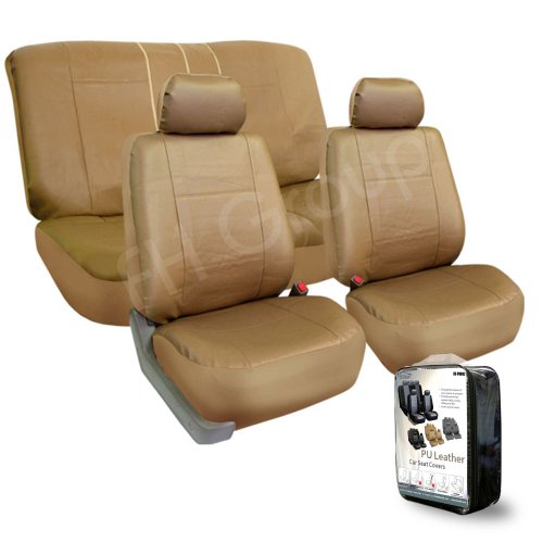 FH-PU002112 Full Set Classic PU Leather Car Seat Covers, Airbag compatible and Split Bench, Tan color- Fit Most Car, Truck, Suv, or Van