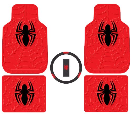 All images of Spider-Man Web Spider Logo Marvel Comics Car Truck SUV Seat Rubber Floor Mats and Steering Wheel Cover - 5PCS
