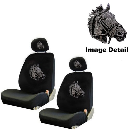 All images of White Champion Horse Gem Crystal Studded Rhinestone Bling Car Truck SUV Front Low Back Bucket Seat Covers with Head Rest Pairs - 4PCS