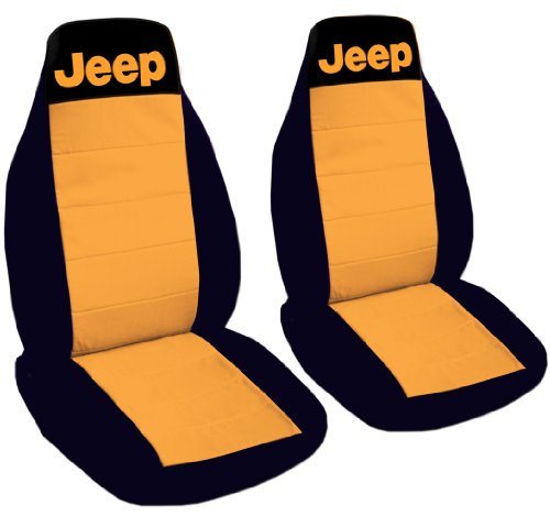 2 Black and Orange "Jeep" seat covers for a 2012 Jeep Wrangler.