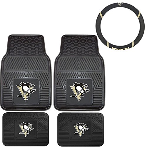 5PC NHL PITTSBURGH PENGUINS RUBBER FRONT & REAR MATS STEERING COVER UNIVERSAL
