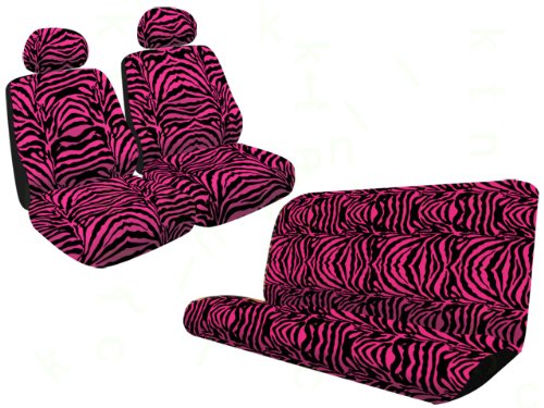 Safari Animal Print Universal Fit Bench Seat Cover and Set of 2 Low Back Bucket Seat Covers with Separate Head Rests - Hot Pink Zebra