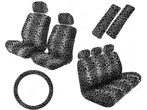 All images of 14 Piece Safari Animal Print Automotive Interior Gift Set - 2 Low Back Front Bucket Seat Covers with Separate Headrest Cover, 1 Steering Wheel Cover, 2 Shoulder Harness Pressure Relief Cover, 1 Bench Cover and 3 Rear Headrest Covers - Snow Leopard